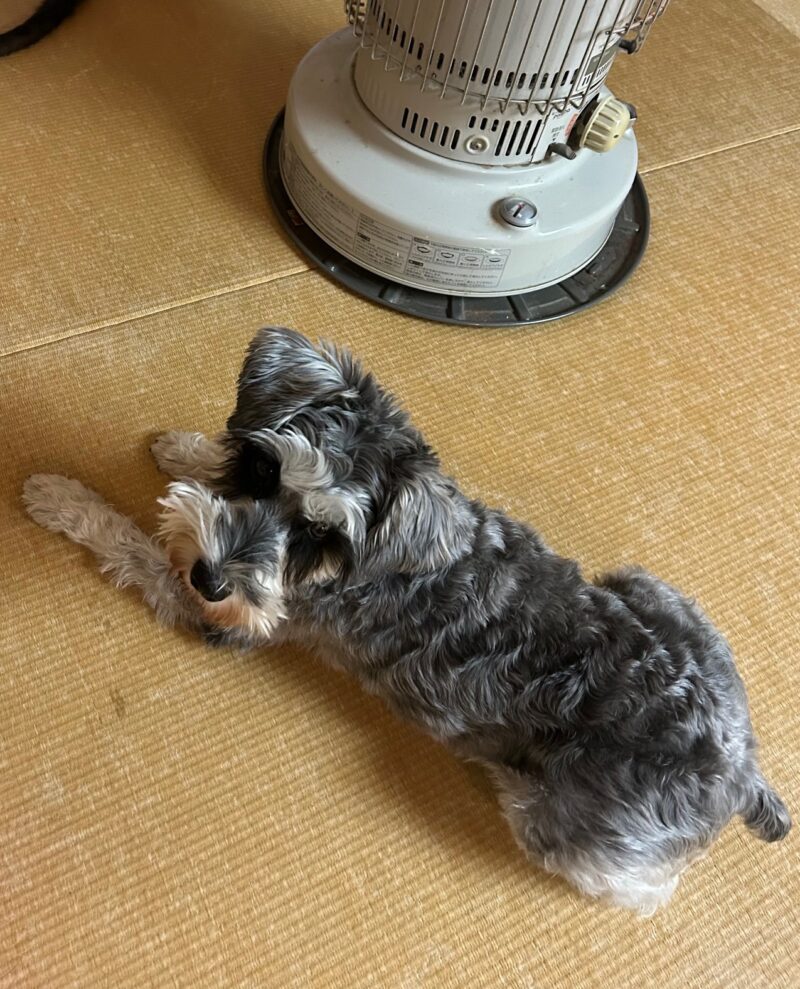 ストーブの前に三角座りしてワンコと一緒に